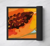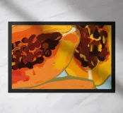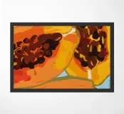 Un'illustrazione lussuosa, dettagliata e ravvicinata di una papaya tagliata a fette, che si concentra sulla sua polpa arancione vibrante e sui semi neri scintillanti. L'opera è una celebrazione ricca e sensuale del frutto tropicale.