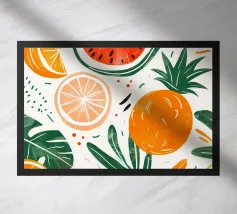 Un'illustrazione vivace e stilizzata di papaya a fette con foglie verde scuro su uno sfondo chiaro. Il motivo ripetitivo e il colore arancione brillante creano un'atmosfera fresca e tropicale.