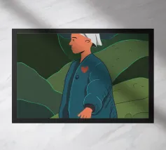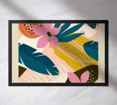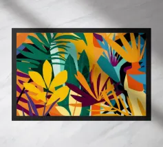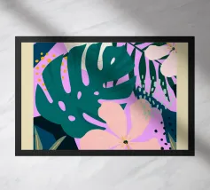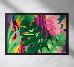 Una lussureggiante scena di giungla incornicia un grappolo d'uva viola, creando una natura morta unica e inaspettata che fonde il fogliame tropicale con la frutta del frutteto in una composizione vibrante.
