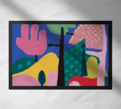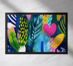 Un patchwork allegro e commovente di piante stilizzate, motivi vivaci e un grande cuore affettuoso. Questa opera d'arte eclettica è una gioiosa celebrazione dell'amore, della crescita e della bellezza artigianale.