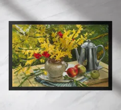 Un pittoresco paesaggio autunnale che raffigura un villaggio o una fattoria adagiata su una collina, circondata da un mosaico di alberi colorati nei toni dell'arancione e del giallo e da campi coltivati, con le lontane montagne blu a completare la scena.