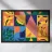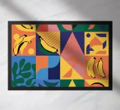 Un audace e dinamico patchwork di forme geometriche, con banane stilizzate e foglie tropicali. La palette di colori vivaci e il forte stile grafico creano una composizione giocosa ed energica.