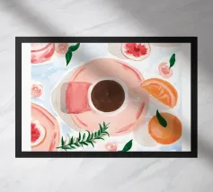 Una natura morta calda e invitante di una tazza di caffè rossa accanto a un ramo di cachi maturi, su una tovaglia a fantasia. La scena è una rappresentazione bella e rilassante di una pausa caffè autunnale.