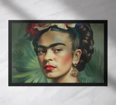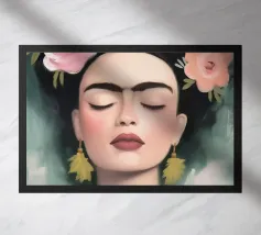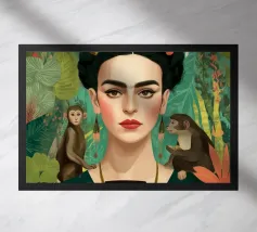 Frida Kahlo gusta il suo caffè in una tazza di fiori, circondata da elementi botanici e accenti floreali. Il suo autoritratto emana eleganza e stile boho, mentre i verdi tenui e i toni della terra sottolineano la sua bellezza naturale.