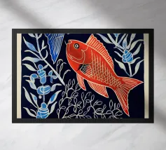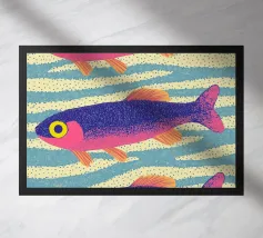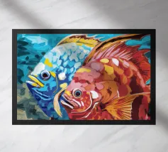 Questo dipinto mostra due pesci che nuotano nell'acqua, circondati da forme colorate simili a coralli. Lo sfondo è un vivace mix di giallo e rosa.