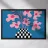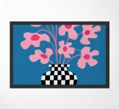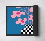 Un'illustrazione audace e grafica di un bouquet di semplici fiori rosa in un sorprendente vaso a scacchi bianchi e neri. L'alto contrasto e le forme semplici creano un pezzo moderno e giocoso con un forte impatto visivo.