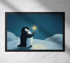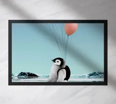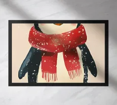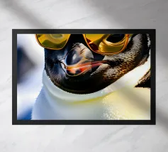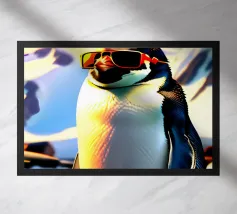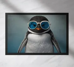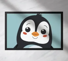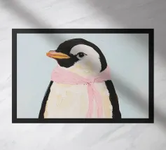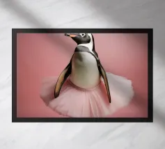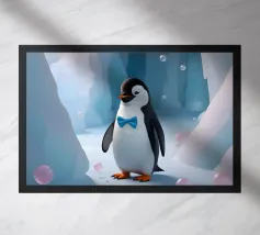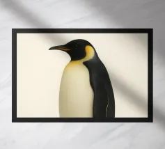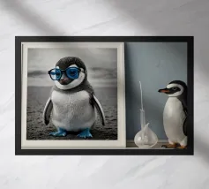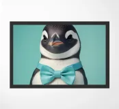 Un'illustrazione divertente ed elegante di un pinguino con papillon in una moderna tavolozza di colori verde acqua. Questa stravagante opera d'arte conferisce un'atmosfera giocosa ed elegante a qualsiasi parete. Perfetto per gli amanti degli animali, per le camere dei bambini, per gli uffici o come regalo unico.