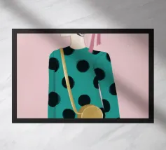 Una donna con borsa rosa e gonna a quadri siede su un'auto verde retrò, con i piedi incrociati con stile.