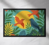 Immergetevi in un'atmosfera tropicale con questo poster Uccelli e sole turchese. Uccelli colorati volano sopra un sole splendente, in un contesto di piante rigogliose. Un poster vintage perfetto per dare un'atmosfera fresca ed esotica alla vostra casa.