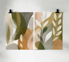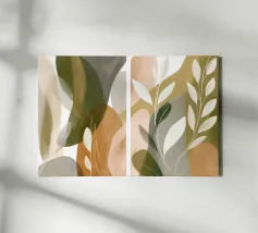 Un dittico di forme di foglie traslucide e strati organici: pura eleganza! I toni morbidi dell'oliva, del beige e del grigio si sovrappongono come carta velina traslucida e creano profondità spaziale. Ispirato a Georgia O'Keeffe, il risultato è un equilibrio meditativo tra natura e astrazione. Le transizioni nebbiose e le foglie bianche stilizzate conferiscono all'opera una raffinatezza senza tempo. Una composizione armoniosa sulla leggerezza, la trasparenza e la sottile bellezza del mondo vegetale: rilassante, elegante, senza tempo. Perfetta per ambienti che combinano la tranquillità naturale con il design moderno.