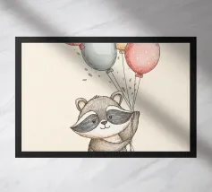 Un affascinante procione tiene in mano un vivace palloncino a forma di cuore, che emana uno spirito giocoso in un design minimalista. Lo sfondo caldo esalta l'atmosfera stravagante della scena.