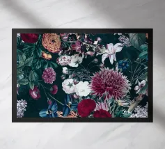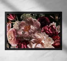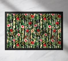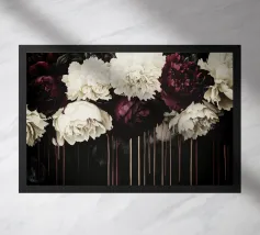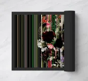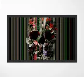 Un bouquet delicato con un tocco dark. Questa opera d'arte rivela un teschio formato interamente da fiori e fogliame lussureggianti, che galleggia su uno sfondo nero profondo. Bande verticali di colore verde neon, rosa arrossato, crema e bianco attraversano l'opera come glitch digitali, squarciando i fiori e conferendo al disegno un'atmosfera moderna, quasi olografica.