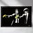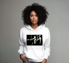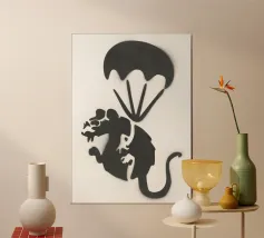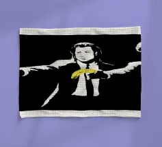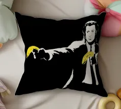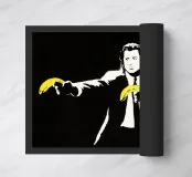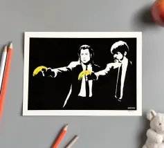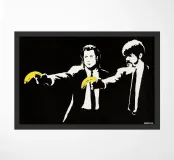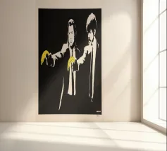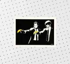 Questa iconica opera di Banksy parodia brillantemente la famosa scena del film Pulp Fiction. Sostituisce le pistole dei protagonisti con banane gialle e brillanti, trasformando un momento di estrema tensione in un momento umoristico. L'opera critica abilmente la violenza delle armi, celebrando al contempo la cultura pop e l'assurdo.