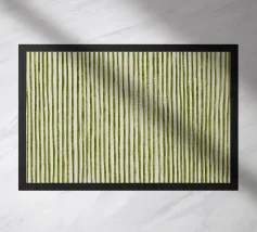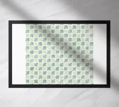 Un motivo ripetuto presenta un'alternanza di quadrati chiari e colonne a righe verdi, creando un effetto a scacchiera. Il design è minimalista e geometrico.