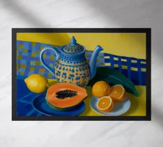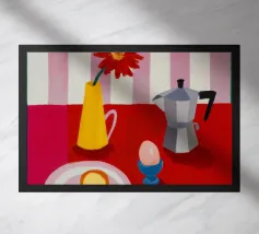 Una nostalgica natura morta con una radio in stile vintage, un piatto di pane e formaggio su un panno di percalle, una tazza di caffè e una bottiglia di vino. La scena evoca un'atmosfera accogliente e retrò, perfetta per una cucina o una sala da pranzo.