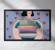 Illustrazione di una donna che tiene un ombrello rosso e indossa un abito colorato a righe arcobaleno. La composizione è una rappresentazione chic, elegante e leggermente malinconica della ricerca del colore in una giornata grigia.