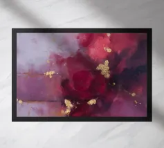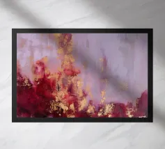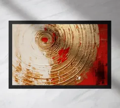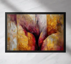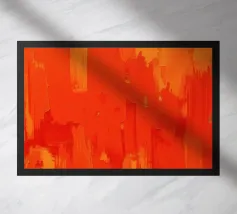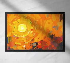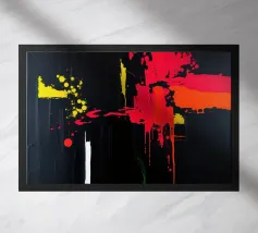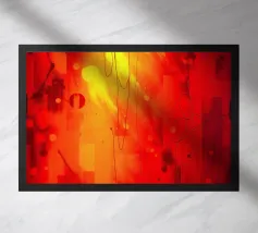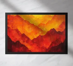 Un dipinto digitale astratto e dinamico, caratterizzato da forme geometriche dai contorni netti e dalle vivaci sfumature rosse, arancioni e gialle, su uno sfondo nero e bordeaux intenso. Il disegno evoca calore, energia e contrasto attraverso il colore intenso e la frammentazione angolare.