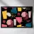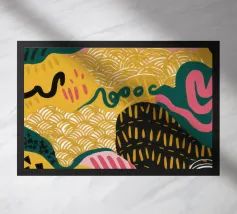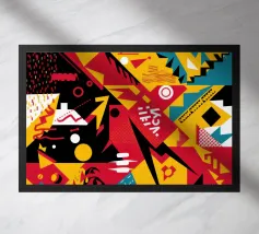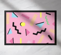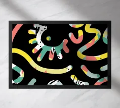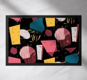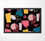 Un motivo dinamico e divertente di forme astratte colorate e di ispirazione retrò è sparso come coriandoli su uno sfondo nero, creando un disegno vibrante ed energico dal sapore vintage.