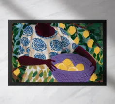 Questa opera d'arte mostra una persona seduta su una sedia a righe, circondata da girasoli e da una borsa verde. Lo sfondo è di un marrone tenue che crea un'atmosfera rustica e riflessiva.