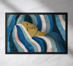 Un delicato ritratto di donna con fluenti capelli biondi o castano chiaro, con gli occhi chiusi o lo sguardo rivolto verso il basso, che indossa un abito blu e argento o bianco dai dettagli intricati che suggeriscono pizzi o armature.