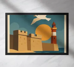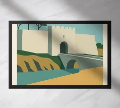 Con l'emblematica statua del cervo, le pareti ocra e il cielo blu brillante, questo poster cattura l'essenza di Rodi. Una città tra l'antichità e il Mediterraneo, presentata qui in uno stile solare e retrò. Un tocco di storia da appendere a casa vostra.