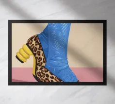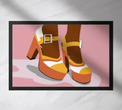Una dichiarazione di moda moderna e stravagante catturata in un'illustrazione di un singolo sandalo nero indossato con un calzino arancione brillante. La composizione è un'interpretazione audace, giocosa e contemporanea della moda "ugly chic".