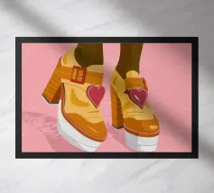 Una dichiarazione di moda moderna e stravagante catturata in un'illustrazione di un singolo sandalo nero indossato con un calzino arancione brillante. La composizione è un'interpretazione audace, giocosa e contemporanea della moda "ugly chic".