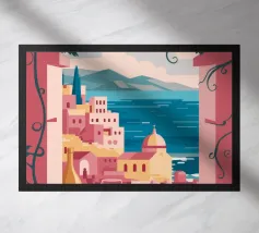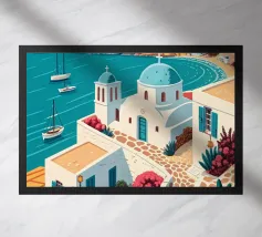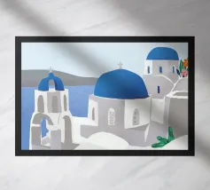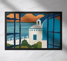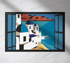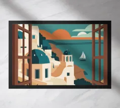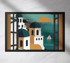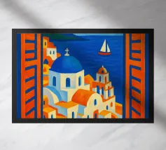 Una vista pittoresca dei classici edifici a cupola blu di un'isola greca come Santorini, visti da una finestra ad arco. Questa splendida scena cattura perfettamente il fascino idilliaco di una vacanza nel Mediterraneo.