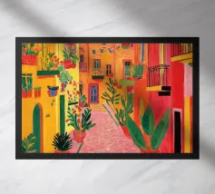 Una splendida natura morta di frutta fresca e bevande su un tavolo apparecchiato su un balcone, con una vista pittoresca di una classica città di mare del Mediterraneo. La scena è una fuga idilliaca e vibrante, che cattura perfettamente l'essenza di una vacanza sulla costa.