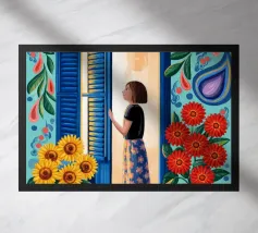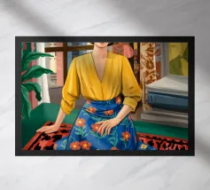 Una donna con un vivace sari verde e giallo si trova con grazia in una stanza con carta da parati a motivi e una porta che conduce a un giardino lussureggiante e illuminato dal sole, incarnando l'eleganza e il legame con la natura.