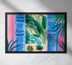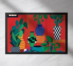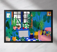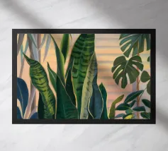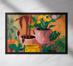 Una bella illustrazione di uno scaffale pieno di piante d'appartamento verdi e rigogliose, immerso nella calda luce del sole. La scena è un tributo sereno e gioioso alla bellezza di un giardino interno.