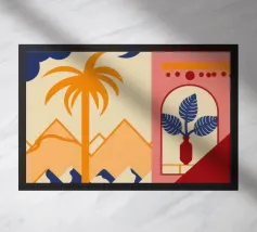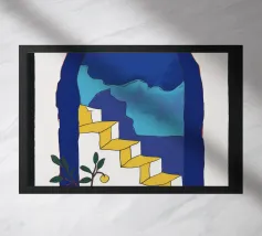 Una scena d'interni stravagante e astratta con una scala rosa, piante in vaso e un sole e una luna nel cielo visti attraverso un arco. L'opera d'arte è un paesaggio da sogno giocoso e bohémien.