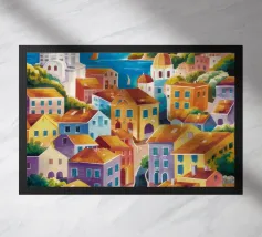 Una vivace scena di strada con edifici colorati e una scalinata rosa acceso che sale verso l'alto, evocando una vivace città costiera mediterranea o italiana.