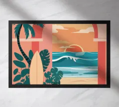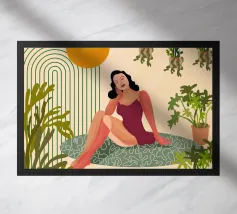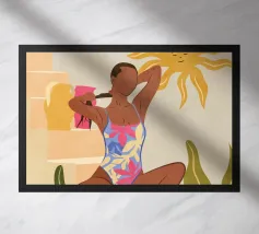 Un'elegante illustrazione di una donna che si rilassa su una scala illuminata dal sole accanto a una palma in vaso, con un gatto seduto vicino. La scena, incorniciata da un arco, è serena, elegante e ha un'atmosfera mediterranea classica.