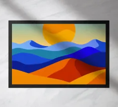 Strati di sagome di montagne sfumano in lontananza, ammorbiditi da un cielo morbido e sfumato che passa delicatamente da toni caldi a tinte fredde, suggerendo l'alba, il tramonto o un'onirica via di mezzo. La composizione evoca profondità, immobilità e sottili emozioni, catturando la tranquilla maestosità delle montagne sotto una luce mutevole. Minimale ma coinvolgente, questo pezzo conferisce un senso di calma e atmosfera a qualsiasi spazio.