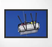 Sciatore in ascensore fotografato dal basso sulle Alpi (Spitzingsee), di Simon Koy.