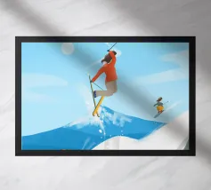 Una figura vestita con un maglione verde e pantaloni rossi pattina sul ghiaccio su uno sfondo rosa con fiocchi di neve. La figura sembra godersi la stagione invernale.