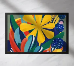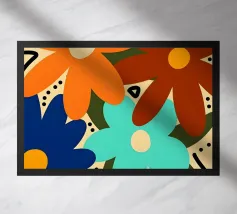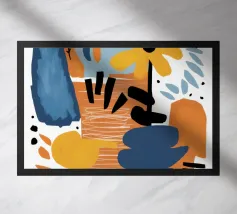 Una forma centrale arancione simile a un fiore esplode in mezzo a un turbinio di forme astratte ed elementi botanici. La composizione è dinamica ed espressiva, con steli blu, accenti rossi e uno sfondo beige strutturato, che cattura un momento di energia creativa.