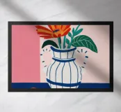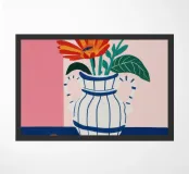 Un delizioso bouquet di fiori colorati e stilizzati irrompe da un vaso bianco a fantasia, su uno sfondo colorato di rosa e arancione, irradiando pura gioia e fascino.