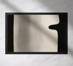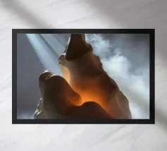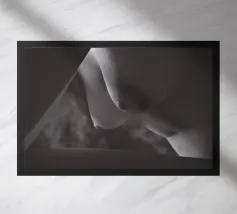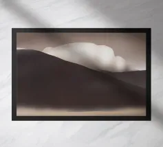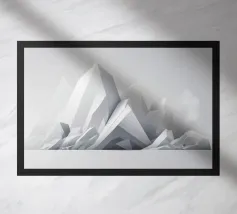 Una rappresentazione monocromatica presenta una forma accartocciata che ricorda in qualche modo una montagna o una formazione rocciosa. Le ombre e le lumeggiature sono state utilizzate per dare alla forma un aspetto tridimensionale, e poggia su uno sfondo più scuro che ne esalta la silhouette.