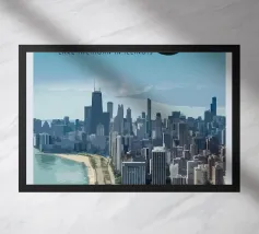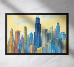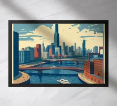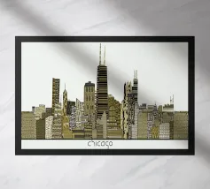 Questo poster mostra l'imponente skyline di Chicago nel caratteristico stile lino print, con la dominante Willis Tower al centro e il lago Michigan in primo piano. Perfetto per gli amanti dell'architettura americana, dell'estetica dello skyline e dei classici poster cittadini. Ideale per soggiorni, uffici o pareti creative dal sapore urbano.