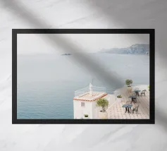 Una tranquilla terrazza costiera immersa nella luce del sole, affacciata sul blu infinito dell'oceano. Il luogo perfetto per rilassarsi, respirare e lasciare andare via le preoccupazioni.