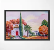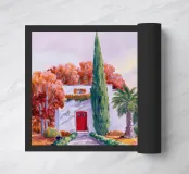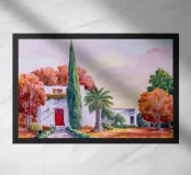 Un sentiero inondato di sole conduce a un'incantevole villa dal tetto rosso, circondata da una vegetazione lussureggiante e da fiori vivaci, creando una scena invitante e idilliaca, piena di calore e colore.