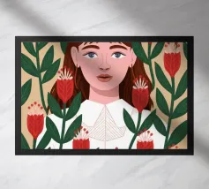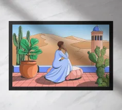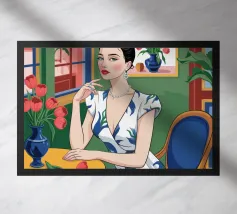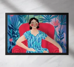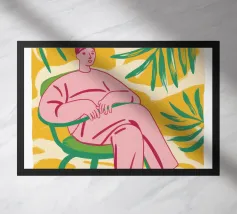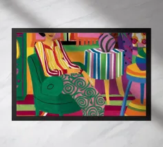 Questa opera d'arte raffigura una persona seduta in una stanza colorata che indossa abiti a righe. Lo sfondo comprende varie piante e mobili, creando un ambiente accogliente e sereno.