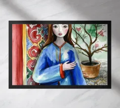 Questa opera d'arte raffigura una persona seduta in una stanza colorata che indossa abiti a righe. Lo sfondo comprende varie piante e mobili, creando un ambiente accogliente e sereno.