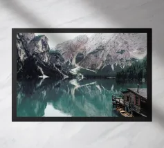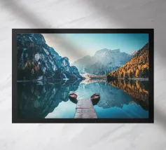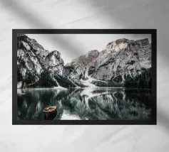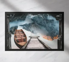 Una barca solitaria riposa pacificamente su un lago di montagna cristallino, circondato da cime imponenti e avvolte dalla nebbia e da una vegetazione lussureggiante. L'acqua a specchio riflette la bellezza senza tempo del paesaggio, creando una scena che sembra non essere stata intaccata dal tempo. Perfetto per portare calma e ispirazione in qualsiasi ambiente.