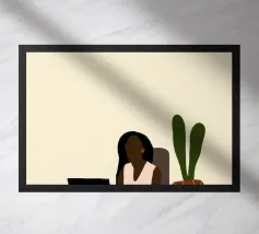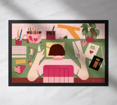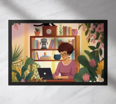 Una persona lavora al computer portatile circondata da libri, carte ed elementi decorativi. Le piante e l'ambiente caldo migliorano l'ambiente produttivo.