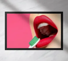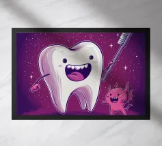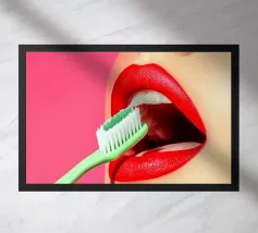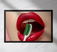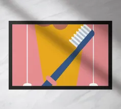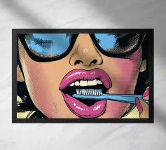 Un'esplosione di freschezza retrò con questa vibrante illustrazione pop art! Caratterizzato da labbra in grassetto, un classico spazzolino da denti pieno di pasta alla menta e un energico sfondo a strisce, questo pezzo irradia una sensazione di frizzante freschezza e di sicura igiene orale. È un'elegante strizzata d'occhio alla pubblicità vintage con un messaggio senza tempo di igiene pulita!