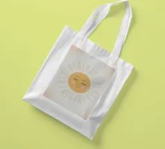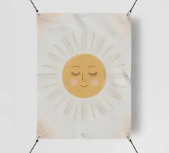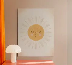 Un'illustrazione minimale di sole disegnata a mano con occhi chiusi e un dolce sorriso, caratterizzata da toni morbidi di pesca e beige. Il design semplice e rilassante conferisce un'accogliente atmosfera bohémien, perfetta per le camerette, le stanze dei bambini o per l'arredamento di una casa tranquilla.