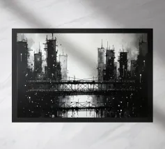 Una composizione surreale in bianco e nero con un'imponente struttura architettonica di ispirazione gotica circondata da acque ferme sotto una forte pioggia. L'illuminazione drammatica e il design intricato evocano un'atmosfera di struggente bellezza.